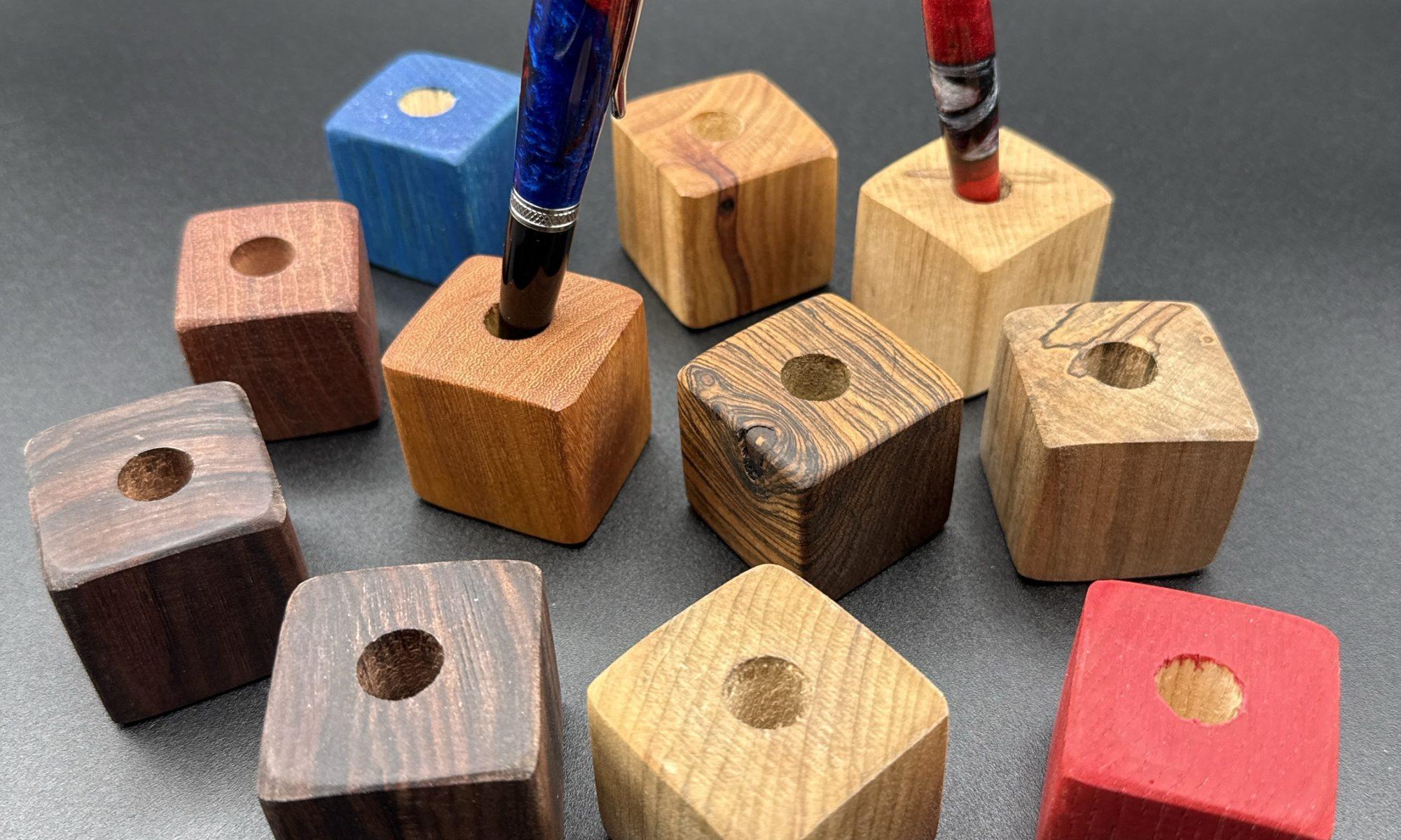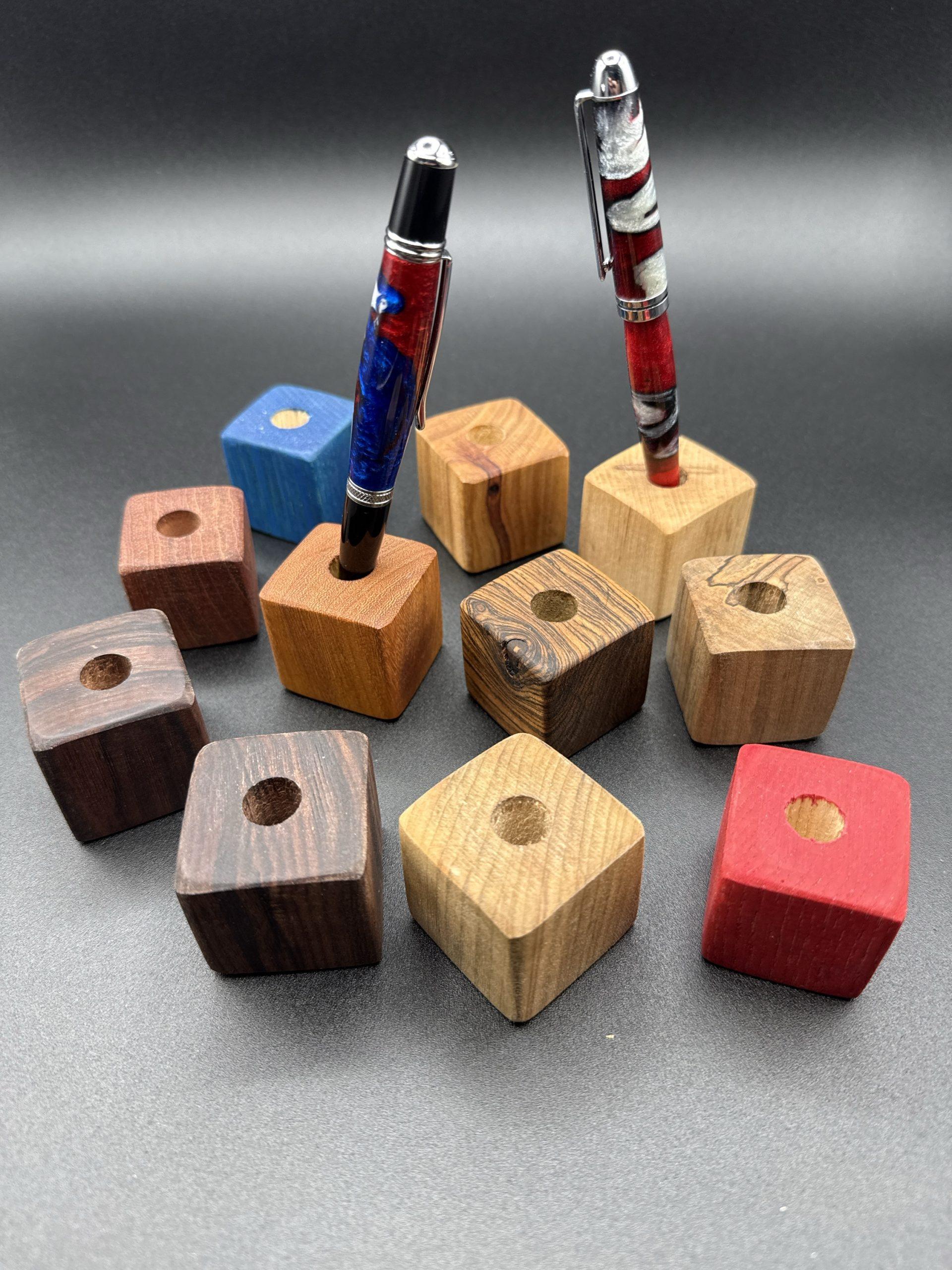 Compact wood blocks to add a little pizazz to your desk while holding your favorite pen or pencil. Approximately 1.5″ cubed each block will hold a variety of sizes of writing utensils. Made from various domestic and exotic woods, each one is unique and ready to complement your style.
