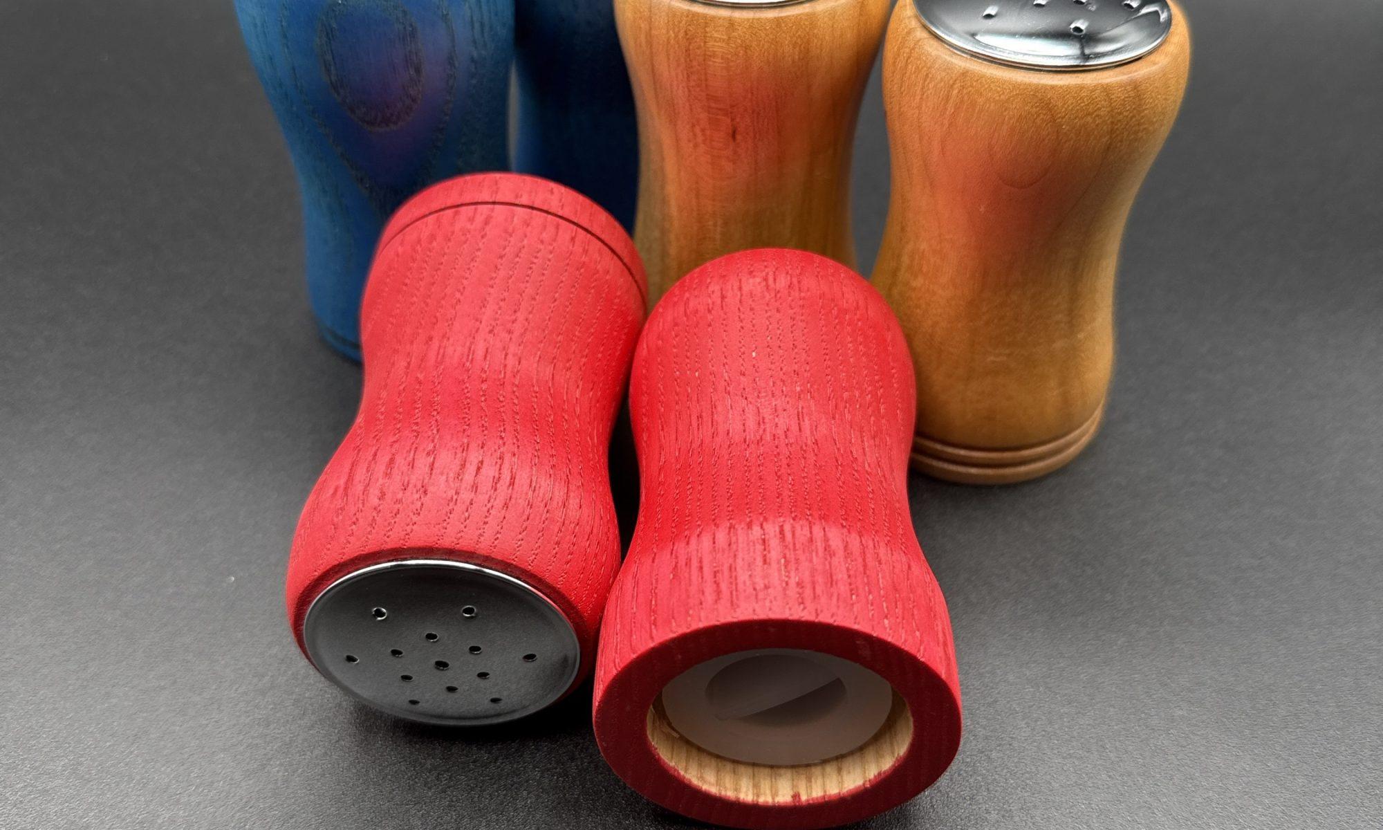 These hand turned Salt & Pepper shakers add sets stand approximately 3″ tall. Each set has a different marking or unique ring count to help determine which container holds the specific spice. Each container is refillable via the silicone stopper on the bottom.
