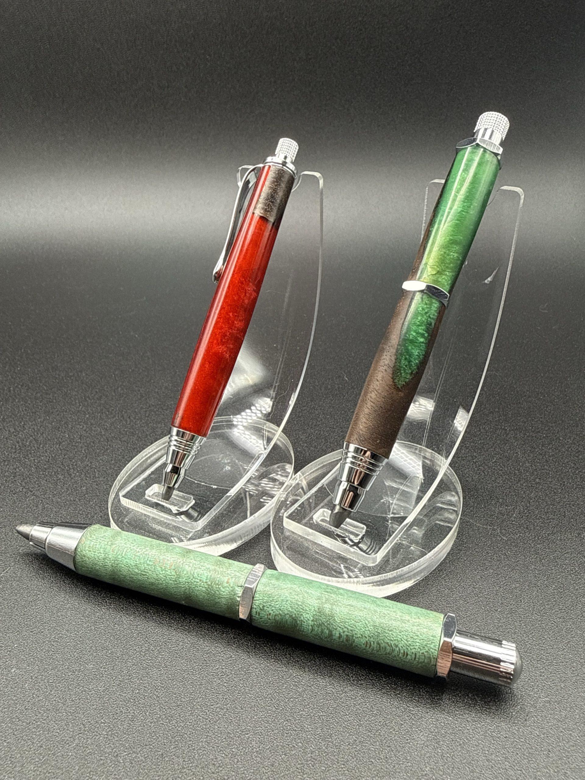 These smaller mechanical style pencils come in two lead thickness options. Great for using to mark lumber in your workshop or use in your artist sketchbook. Small enough to toss in a pocket or clip on your apron, they make a great tool for both Artists and Woodworkers alike. Each style hides the lead sharpener in the plunger. Unscrew the cap and sharpen your lead when it gets too dull.
